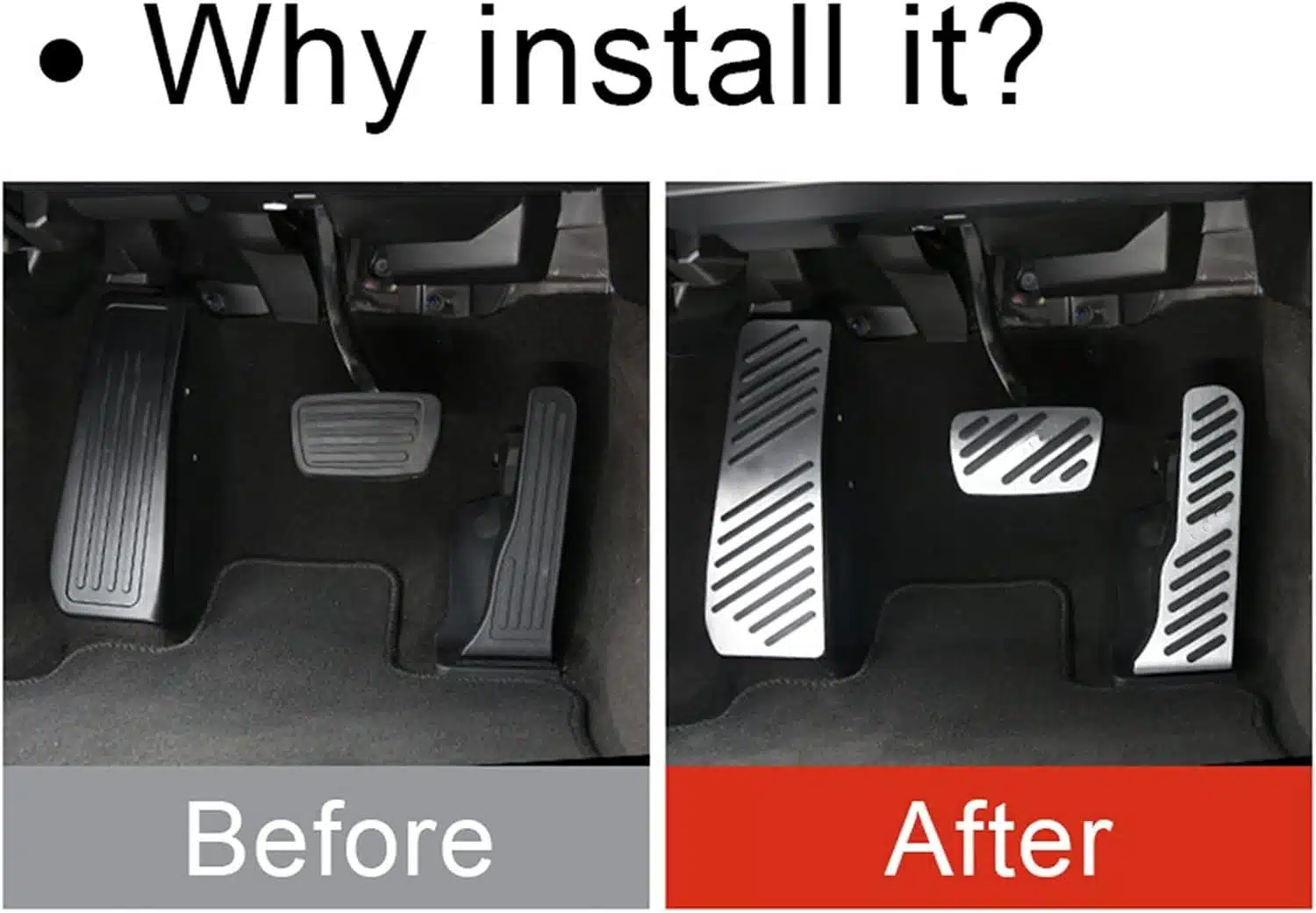 Easy To Install: Please remove the existing rubber (brake pedal only) before installation. No drilling or welding is required! Immerse the pedal cover in hot water or use soap on the rubber part to relax the rubber part, which will make it easier to install!